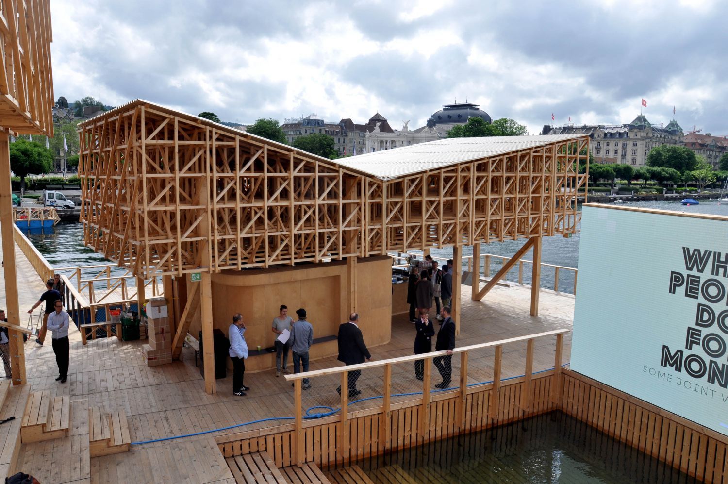 Der imposante Pavilion of Reflections wurde vis-a-vis vom Sechseläutenplatz im Zürichsee verankert. Am Samstag öffnet er offiziell seine Tore – oder besser gesagt seinen Steg. Von der schwimmenden VIP-Lounge der Fussballeuropameisterschaft waren Pontons übrig geblieben. Diese bilden nun die Basis für den neuen hölzernen Pavillon, der von 30 Studierenden des Studios von Tom Emerson an der ETH Zürich entworfen und (mithilfe diverser Spezialfirmen für Holz-, Wasser- oder Stahlbau) in mehreren Wochen zusammengebaut wurde. Die Holzkonstruktion wurde in Winterthur vorproduziert und dann von 15 Zimmermännern und Zimmermann-Lehrlinge zusammen mit einigen der ETH-Studierenden auf die stählerne Unterkonstruktion montiert. Die räumlichen Fachwerke für zwei Dächer, Tribüne und Turm wurden aus circa 100 000 Profilen zusammengefügt. Wegen des geringen Querschnitts der Hölzer von nur fünf mal fünf Zentimetern wirkt die Konstruktion leicht und luftig und aus der Fernwirkung zudem grösser als sie eigentlich ist.