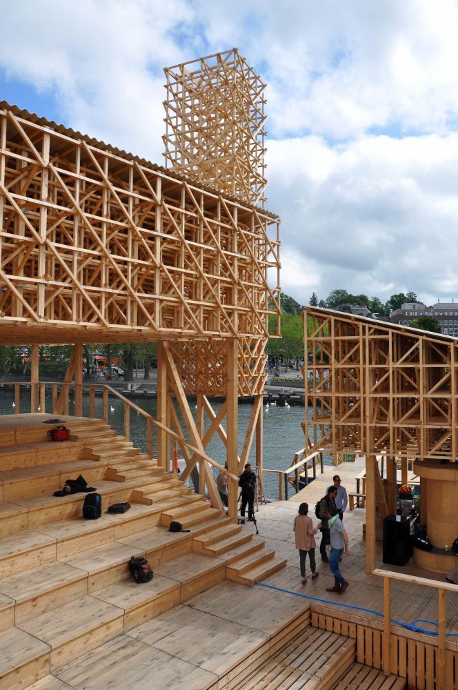 Der imposante Pavilion of Reflections wurde vis-a-vis vom Sechseläutenplatz im Zürichsee verankert. Am Samstag öffnet er offiziell seine Tore – oder besser gesagt seinen Steg. Von der schwimmenden VIP-Lounge der Fussballeuropameisterschaft waren Pontons übrig geblieben. Diese bilden nun die Basis für den neuen hölzernen Pavillon, der von 30 Studierenden des Studios von Tom Emerson an der ETH Zürich entworfen und (mithilfe diverser Spezialfirmen für Holz-, Wasser- oder Stahlbau) in mehreren Wochen zusammengebaut wurde. Die Holzkonstruktion wurde in Winterthur vorproduziert und dann von 15 Zimmermännern und Zimmermann-Lehrlinge zusammen mit einigen der ETH-Studierenden auf die stählerne Unterkonstruktion montiert. Die räumlichen Fachwerke für zwei Dächer, Tribüne und Turm wurden aus circa 100 000 Profilen zusammengefügt. Wegen des geringen Querschnitts der Hölzer von nur fünf mal fünf Zentimetern wirkt die Konstruktion leicht und luftig und aus der Fernwirkung zudem grösser als sie eigentlich ist.