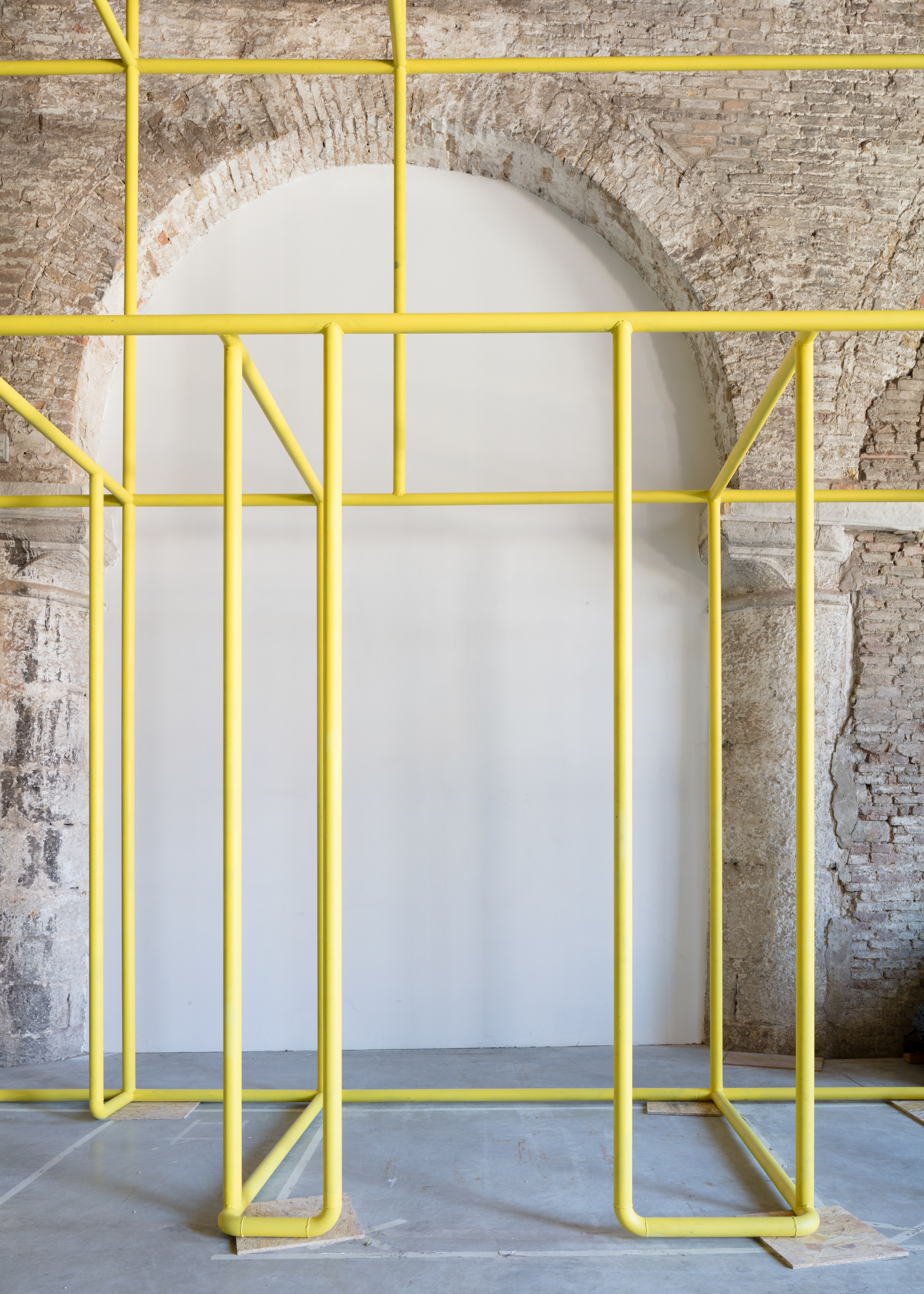 Usbekistan, erstmals auf der Architekturbiennale vertreten, widmet sich dem Thema der Mahalla, also der traditionellen lokalen Wohn- und Wirtschaftseinheit. Dafür haben Emanuel Christ, Christoph Gantenbein und Victoria Easton als Kurator*innen den Umriss eines für die Mahalla typischen Atriumkomplexes mit gelb lackierten Stahlrohren im Ausstellungsraum im Massstab 1:1 nachgebildet, während zwölf Fotos von Bas Princen ausschnitthaft auf die Materialität der Gebäude verweisen. Auch wenn die abstrakte Herangehensweise räumlich überzeugt, stellt sich Ratlosigkeit ein. Denn wie Mahallas wirklich funktionieren und in welchem Masse das Zusammenleben dort vorbildlich ist oder nicht, erfährt man nicht.