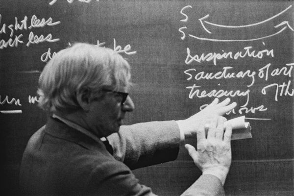 Der 125. Geburtstag von Louis Isadore Kahn (1901–1974) erinnert mich an die Beziehung dieses Meisters der Architektur des 20. Jahrhunderts zu Zürich. Auf Initiative von Heinz Ronner fand 1969 eine grosse Kahn-Ausstellung in der Haupthalle der ETH Zürich statt. Kahn eröffnete die Ausstellung am 12. Februar 1969 im Auditorium Maximum nicht mit einem Dia-Vortrag, sondern, wie er es nannte, einem Vortrag als Zeichnung. «So ist die Zeichnung heute ein Gespräch», sagte er und hielt seine Gedanken mit Kreide auf zwei grossen Wandtafeln fest.